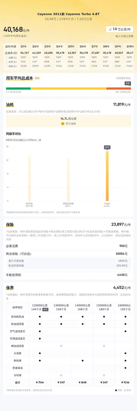 当前市场上,这款车型的二手车行情大致在17万至27万之间。当然,具体的成交价格会受到车龄、里程以及保养状况等因素的影响。接下来,我们将分析这款车的年均综合用车成本。据估算,这辆车的年均综合用车成本约为4万元左右。这个数字并不算低,主要与保险费用、保养成本以及燃油消耗等因素有关。