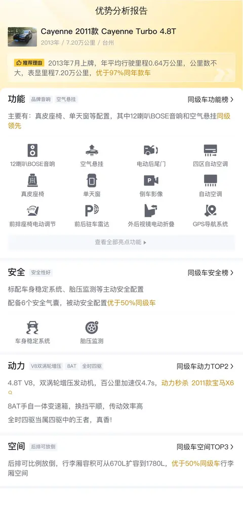我们今天的主角是保时捷Cayenne 2011款 Turbo 4.8T,目前二手车报价20.98万。该车于2013年7月在台州上牌,至今行驶里程为7.2万公里。车身颜色为黑色,共有3次过户记录。值得一提的是,这款车符合国III排放标准,不过考虑到其车型年份,这并不是我们关注的重点。