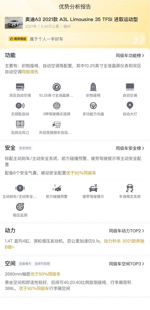 这辆车的具体版本是奥迪A3 2021款 A3L Limousine 35 TFSI 进取运动型,首次上牌时间为2021年7月,车源地和上牌地均为福州,车身颜色为白色,截至目前表显里程为5.4万公里,未有过户记录,符合国VI排放标准。