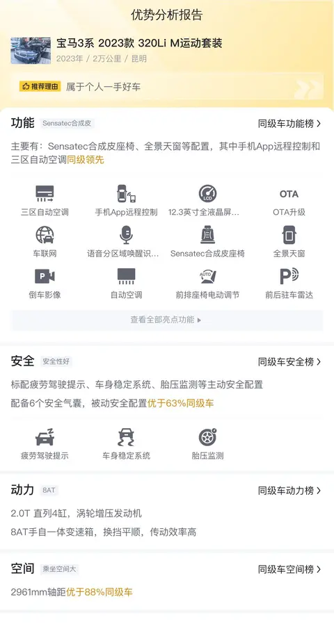 综上所述,这款宝马3系 2023款 320Li M运动套装在市场表现、动力性能、配置丰富度以及品牌价值等方面都有着不错的表现。它是一款适合追求驾驶乐趣和豪华体验的消费者的车型。然而,潜在买家也需要考虑到车辆的维护成本、后排空间局促以及悬架偏硬等问题。总体而言如果你能接受这些小缺点那么这款车将为你带来一次不错的驾乘体验。