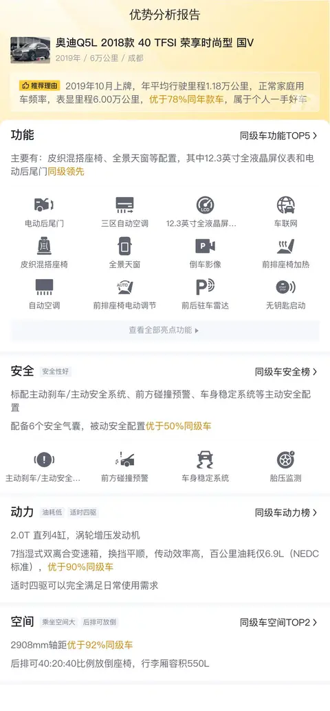 该车是B9世代奥迪Q5L的早期款型,采2.0升涡轮增压四缸引擎,能迸发190匹马力与320牛顿米扭力,搭配七速S tronic双离合变速系统,赋予驾驶平顺而强劲的动力体验。做为荣享时尚型,内饰采用高级材质,座椅采皮革包覆,兼顾舒适与质感,中控区域配备彩色触控屏,支援导航、蓝牙电话及多媒体娱乐功能,科技感十足。此车轴距长达2908毫米,车身尺寸适中,提供充裕乘载空间与550升后备箱容量,无论是家庭出行或是商务接待,都能轻松应对。其综合油耗为6.9升/百公里,兼顾性能与燃油经济性,是一辆集优雅、性能与实用于一身的豪华SUV,适合追求高品质移动生活的消费族群。