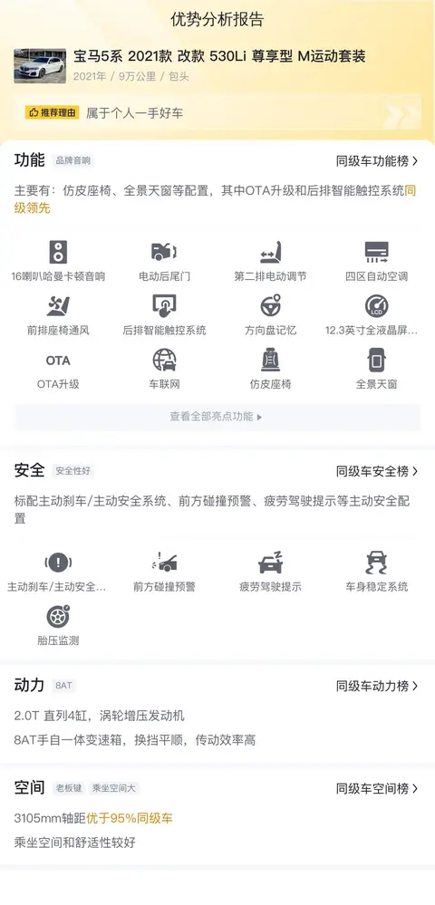 这辆二手宝马5系的具体版本是——宝马5系 2021款 改款 530Li 尊享型 M运动套装。该车搭载2.0T直列4缸,涡轮增压发动机,8AT手自一体变速箱,换挡平顺,传动效率高。3105mm轴距优于95%同级车,乘坐空间和舒适性较好。接下来,让我们从车况、配置、性能、空间等多个方面对这辆车进行详细了解。