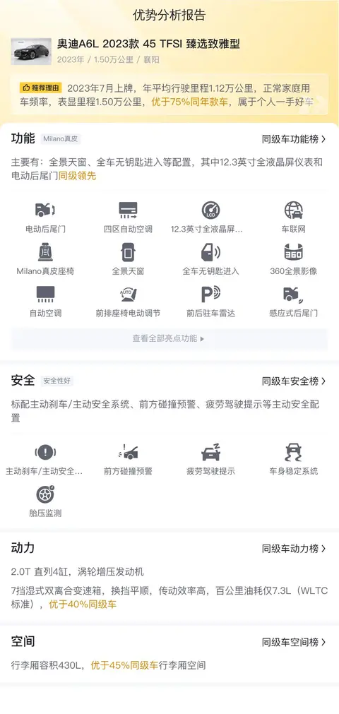 综上所述的新车含税价、用车成本、市场行情、优势分析、同款比价等数据仅供参考。在配置部分,因为二手车非标品,车辆可能会存在配置改装的情况,具体车况信息需要线下结合车辆实际情况进行综合参考。