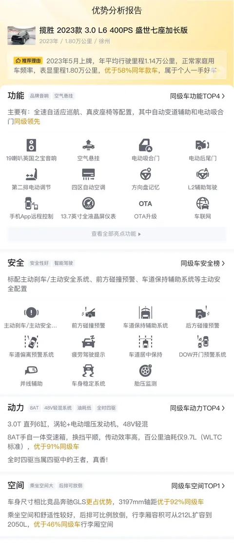 优势:这款车的配置确实全面,不仅有OTA升级,还有L2辅助驾驶,都是目前比较主流的配置。加上本身空间大,动力强,越野性能出色,受到了不少消费者的喜爱。而且该车是2023年5月上牌的首任车主自用一手车,到现在行驶了1.8万公里,算是轻度使用,价格却很实惠。