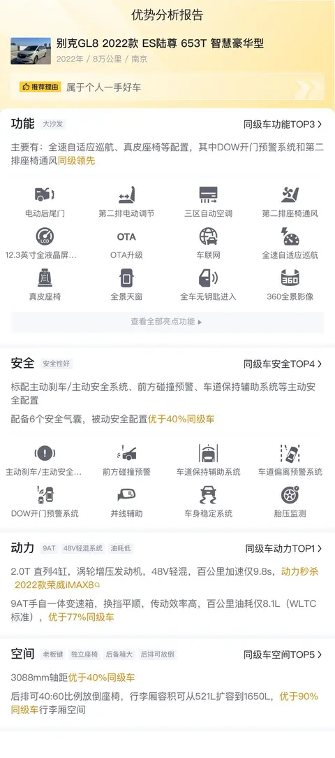 在激烈的市场竞争中,别克GL8 2022款 ES陆尊 653T 智慧豪华型凭借其卓越的综合实力,在同级车型中展现出独特的竞争优势。首先,其宽敞的内部空间和舒适的乘坐体验,使得它在面对本田奥德赛、丰田塞纳等竞品时,能够为乘客提供更为优越的出行感受。其次,先进的动力系统与丰富的智能科技配置,也让它在技术创新层面保持着领先地位。然而,也有部分潜在消费者可能会考虑到别克品牌的保值率相对较低,以及可能存在的小毛病和故障问题,这些因素可能会影响他们的购买决策。尽管如此,GL8凭借自身的多项优势,依然能够在同级市场中占据一席之地,并为追求高品质生活的用户带来满意的驾乘体验。