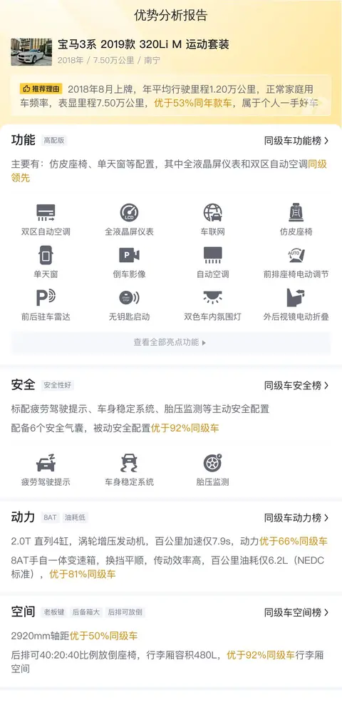 今天介绍的这款二手宝马3系2019款 320Li M 运动套装位于南宁,上牌日期2018年8月,表显里程7.5万公里,白色车身深色内饰,新车指导价33.98万,二手车报价12.68万,过户次数0次。支持分期购车,首付3.69万即可开回家。