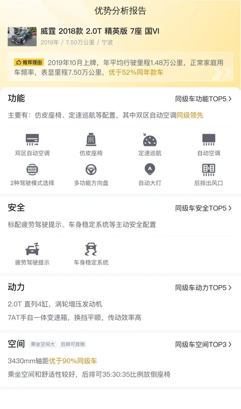 该车是一款黑色威霆 2018款 2.0T 精英版 7座 国VI,车源地和车牌地都是宁波,上牌时间为2019年10月,有3次过户记录,跑了7.5万公里,比常规家庭用车频率稍高,可能是公司车的可能性比较大。新车指导价28.98万,现价15.99万。