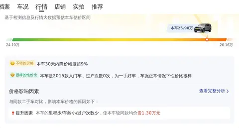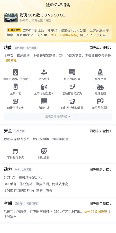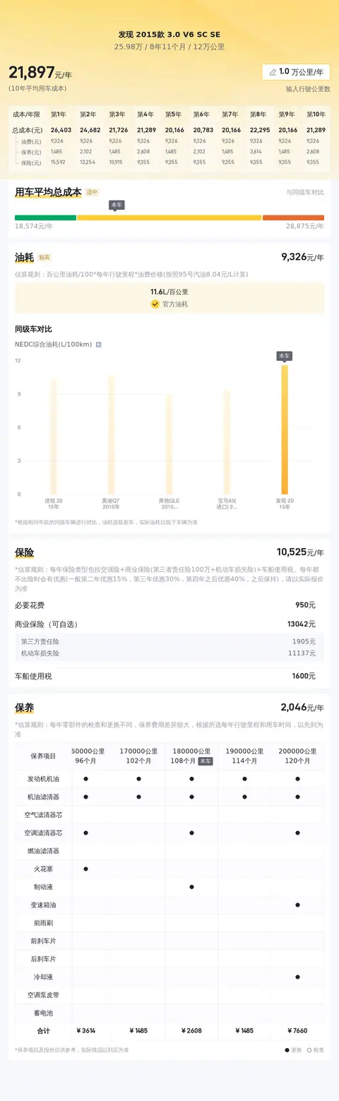根据当前市场行情,这辆发现2015款3.0 V6 SC SE的估价在26.94万至34.63万之间,而卖家给出的价格为25.98万,这一价格极具竞争力,为购车者提供了一个性价比较高的选择。在用车成本方面,根据估算,这辆车的年均综合用车成本约为2.2万元,这一成本在同级别车型中处于较高水平,主要是由于其较高的油耗和维护成本所致。