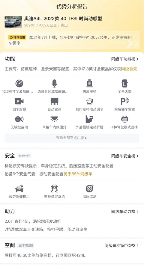 今天我们要看的这辆奥迪A4L 2022款 40 TFSI 时尚动感型,这辆车的上牌地为广东佛山,上牌日期2021年7月,表显里程4.09万公里,新车指导价32.18万,二手车报价17.28万,过户次数1次。