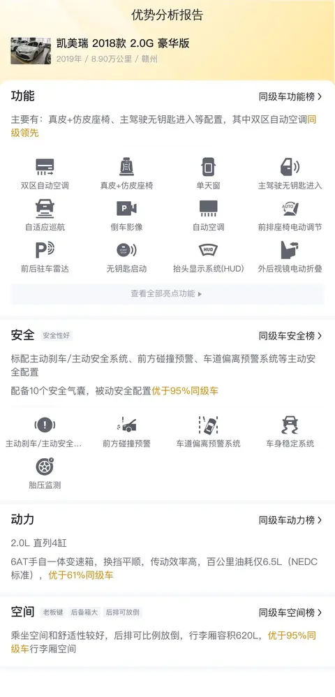今天给大家带来的这款凯美瑞 2018款 2.0G 豪华版,上牌地车源地均为江西赣州,上牌时间为2019年3月,表显里程8.9万公里,新车指导价19.98万,二手车报价10.83万,过户次数3次,车身颜色为白色。