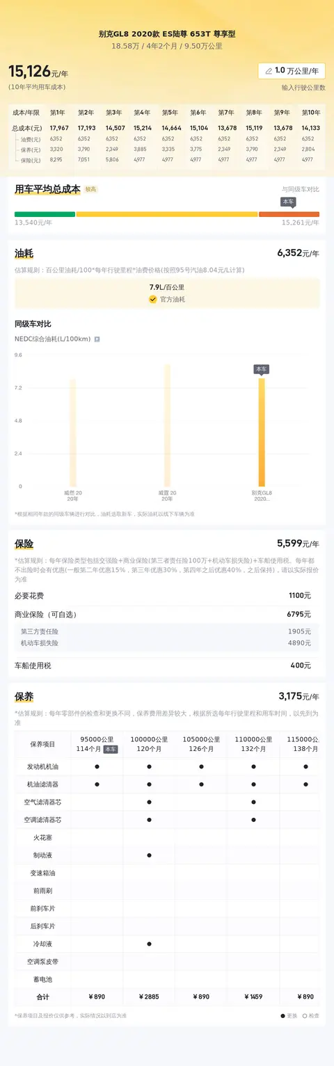 根据估算,别克GL8 2020款 ES陆尊 653T 尊享型的10年平均用车成本是15180元/年,而同级车的最低是11270元/年,最高是16938元/年,处于中间值,不过也偏高。