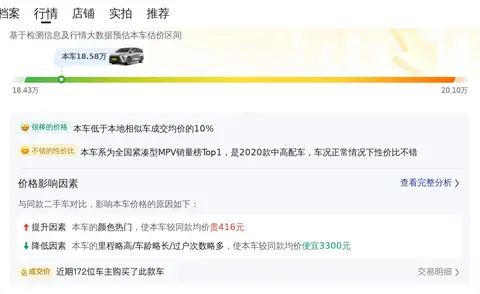 二手别克GL8 2020款 ES陆尊 653T 尊享型的市场行情价是20.17万-24.05万,它的报价则是18.58万,报价低于市场行情,同时它的保值率也很高,所以很占优势。