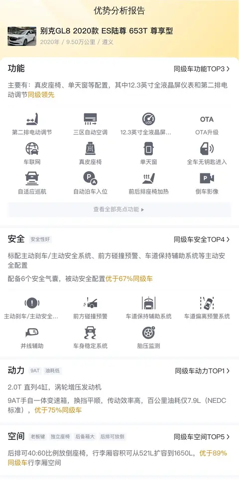 综上所述,这辆二手别克GL8 2020款 ES陆尊 653T 尊享型各方面表现还是很出色的,尤其是空间上,作为全家出行的座驾再合适不过,家用、旅行都能轻松拿下。配置上也比较丰富,可以带给家人舒适的体验。不过作为燃油车,油耗也不低,用车成本高,需要慎重考虑。好在价格不高,入手压力不大,还能享受到高品质生活,也很不错。