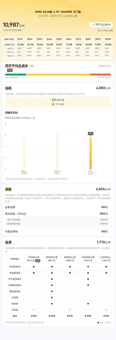 买车不仅要喜欢,还得考虑养车成本。根据估算,这辆MINI的年均综合用车成本在1.1万元左右,对于一辆个性小车来说,这钱花得还算合理。保险费用一年大约6154元,保养费用一年约1882元,这些都在预料之中。不过话说回来,对于喜欢MINI的人来说,这点花费算啥?开心就好!