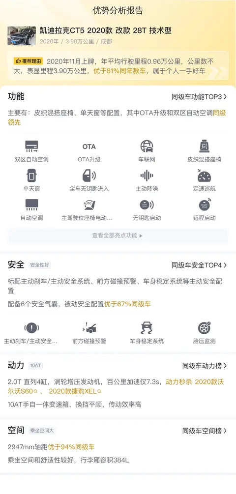 综上所述,这辆凯迪拉克CT5 2020款 改款 28T 技术型在配置、动力、空间等方面都有着不错的表现,同时价格也比较合理,年均综合用车成本也相对合理,这几点让这辆车在二手车市场还是有不错的竞争力的,如果你正在寻找一辆豪华中级轿车,那么这辆车还是值得考虑的。