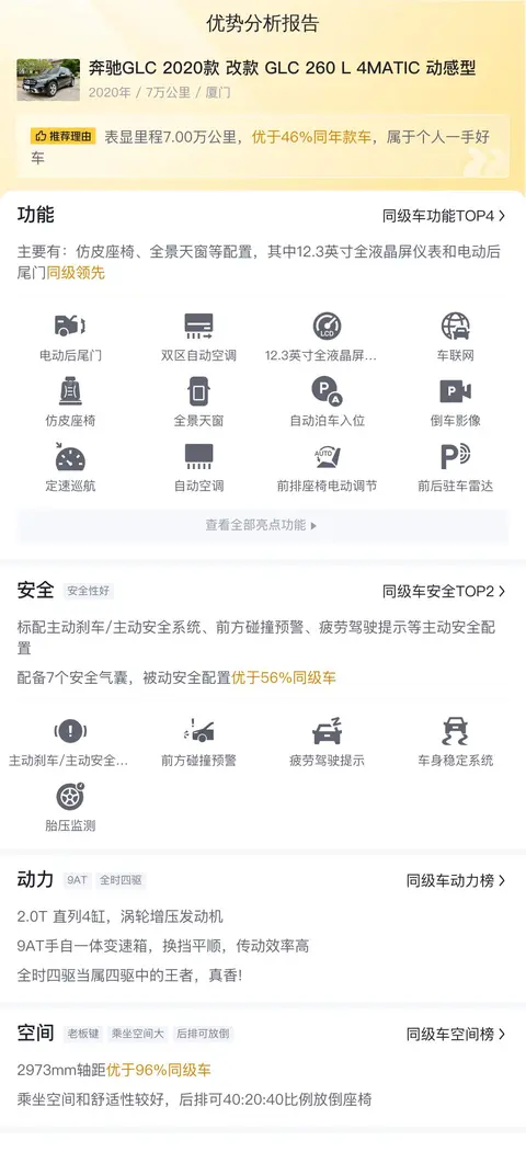 这辆奔驰GLC 2020款 改款 GLC 260 L 4MATIC 动感型在各方面都展现出了豪华品牌的实力和魅力。无论是外观设计、动力性能、内饰配置还是安全系统,都表现出色。作为一辆二手车,它也保持着良好的车况和合理的售价。如果您正在寻找一辆豪华SUV作为日常代步或长途自驾旅行的伴侣,那么这辆奔驰GLC 2020款 改款 GLC 260 L 4MATIC 动感型无疑是一个值得考虑的选择。当然,在购买二手车时,还需要注意检查车辆的车况、保养记录等方面的信息,以确保购买到一辆真正优质和可靠的车辆。