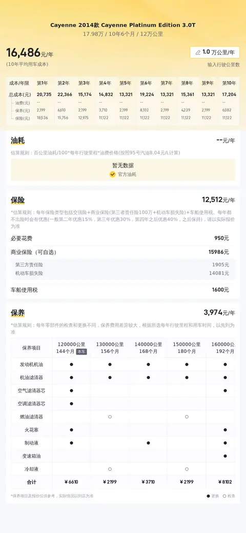 咱们今天说的这辆Cayenne 2014款 Cayenne Platinum Edition 3.0T,定位是中大型SUV,车身外观颜色为白色,内饰是深色配色。车源地和上牌地都是济南。2014年5月首次上牌,期间过户0次。同时至今累计行驶里程是12万公里,该车符合国IV排放标准。新车含税价为115.42万,而现在的二手车报价是17.98万。