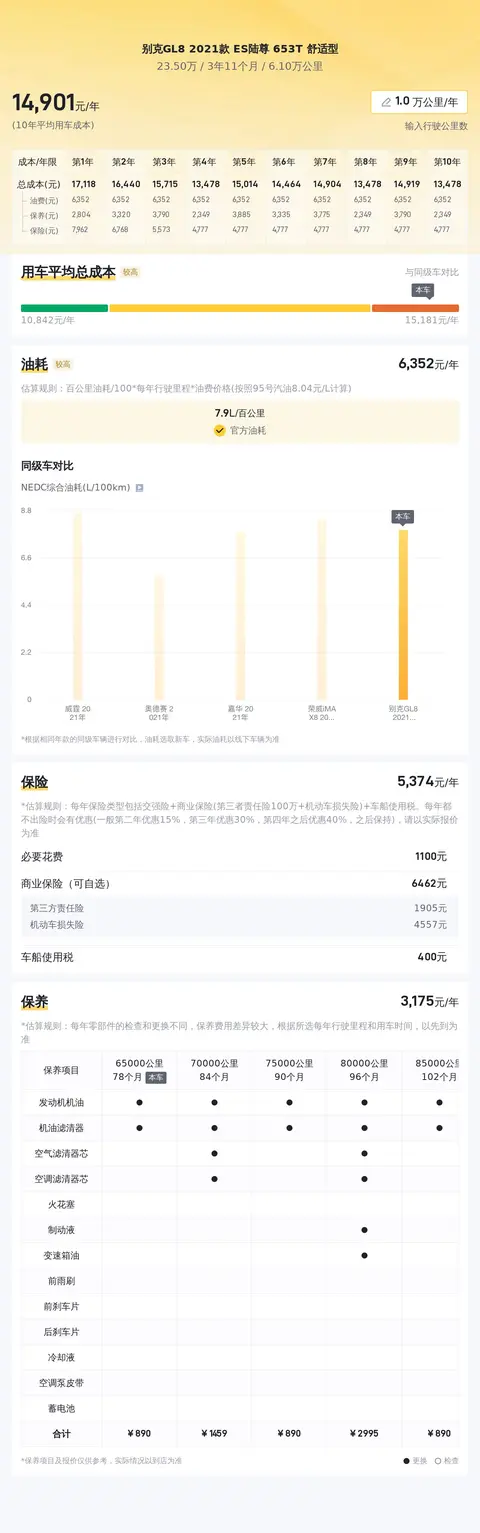 据估算,别克GL8 2021款 ES陆尊 653T 舒适型的用车成本也高,因为同级车的最低用车成本是13928元/年,最高是16971元/年,而别克GL8 2021款 ES陆尊 653T 舒适型的是15681元/年。