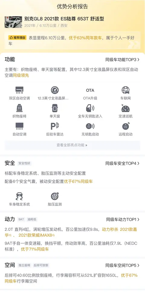优势:作为MPV的扛把子,别克GL8名气在外,市场欢迎度高,保值率也高。整体的舒适性好,这一款上头使用较少,基本数据保持的很好,动力强劲,配置丰富。空间大,适合全家出行。商用也不错,比较有面子。