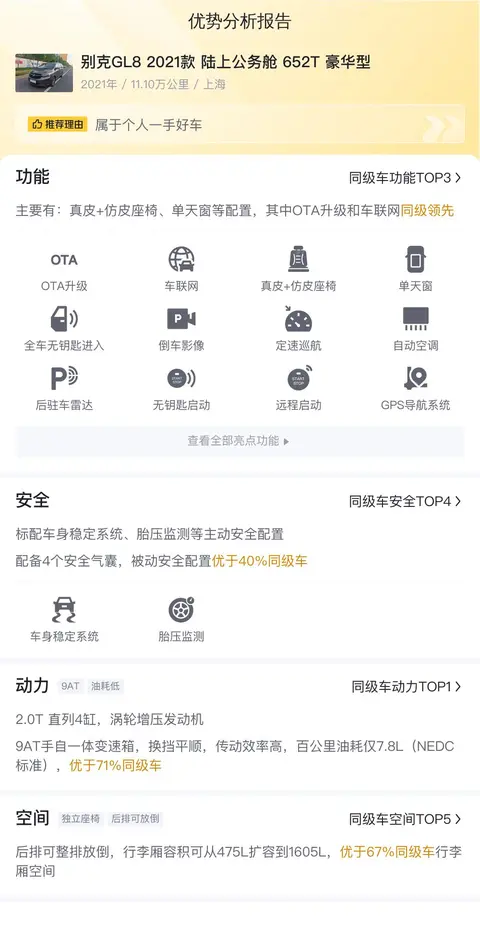 优势:作为MPV的扛把子,别克GL8是公认的品质好车,市场欢迎度极高,保值率也高。该车型配置丰富,使用体验好。空间大,适合全家出行。价格相对来说比较实惠。大品牌,有保障。
