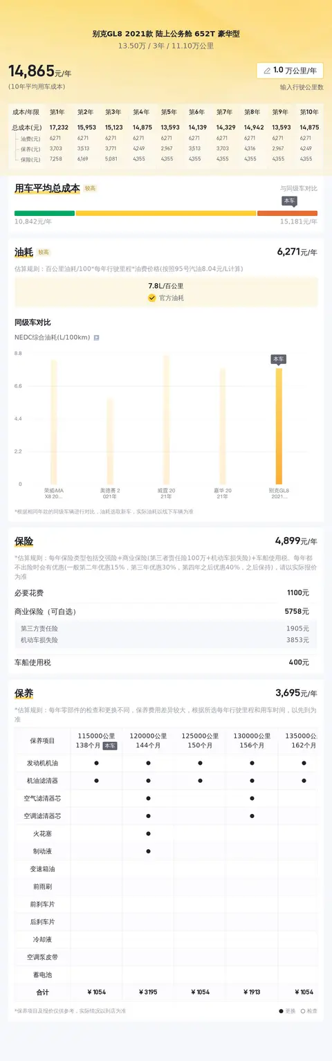 据估算,别克GL8 2021款 陆上公务舱 652T 豪华型的用车成本是15173元/年,动力表现不算优秀,同时油耗也不算低,所以用车成本不算低。