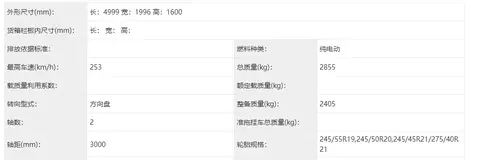 看完外观部分,咱们再来看看工信部申报的其他信息,车身长宽高分别为4999x1996x1600mm,轴距3000mm,整备质量为2405kg。