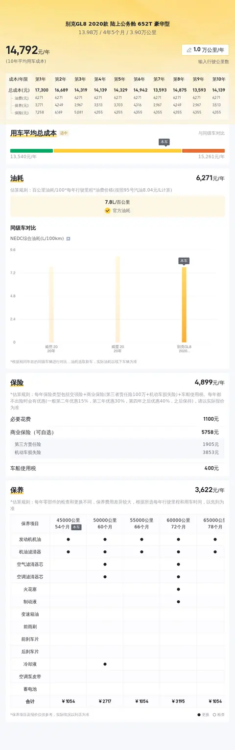 在用车成本方面,根据相关数据显示,这辆二手别克GL8 2020款 陆上公务舱 652T 豪华型的百公里油耗为7.8L,按照每年行驶2万公里计算,每年的油费约为13,468元。保险费用方面,每年约需6,597元,其中包括交强险、商业险和车船使用税。保养费用方面,每年大约需要3,158元,这包括了常规保养和零部件更换等费用。此外,每年还需预留一定金额作为日常损耗和意外支出的储备金,建议预留金额为1,000元。综上所述,这辆二手别克GL8每年的用车成本大约在24,000元左右。值得注意的是,用车成本会因个人驾驶习惯、用车频率、油价波动等因素而有所差异。在购买二手车时,除了关注车辆价格外,还应充分考虑长期使用的实际成本,以便做出更加明智的购车决策。