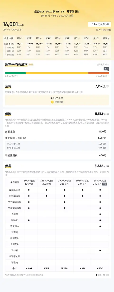 这辆别克GL8 2017款 ES 28T 尊享型 国V按每年行驶2万公里计算,燃油费用约21693元/年,保养费用约3780元/年,保险费用约6330元/年,平均用车成本约10691元/年。实际费用根据用车强度和环境等因素有所改变。