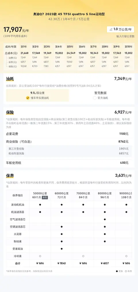 在日常使用过程中,车辆的使用成本也是我们需要考虑的重要因素之一。根据数据显示,这辆奥迪Q7的百公里油耗为9.6L,虽然略高于部分同级别车型,但考虑到其出色的动力性能,这一油耗表现仍然相当合理。按照每年行驶2万公里计算,这辆奥迪Q7的年均综合使用成本大约为18678元,这一费用在同级别车型中属于中等偏下的水平。其中,油费约为15360元/年,保险费用约为6459元/年,保养费用约为1050元/年。这些费用都属于正常的用车支出范围之内。值得一提的是,这辆奥迪Q7还配备了空气悬架系统,能够根据路况自动调整车身高度和硬度从而提供更加舒适的驾乘体验。同时其配备的多项智能驾驶辅助系统也能有效降低驾驶疲劳并提高行车安全性。这些配置的加入不仅提升了驾驶的舒适性和安全性,也进一步降低了日常用车过程中的潜在成本。