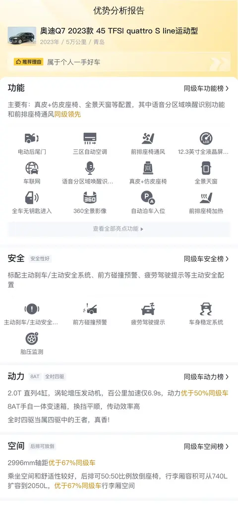 在配置方面,这辆奥迪Q7同样表现出色。它配备了全速域自适应巡航、L2级驾驶辅助等多项智能驾驶辅助系统让驾驶更加轻松便捷;手机无线充电、车内氛围灯等配置则为驾乘者带来了更加舒适便捷的用车体验。其中的一些配置甚至超越了同级别车型的平均水平,比如手机无线充电和车内氛围灯等配置都让这辆奥迪Q7更具竞争力。