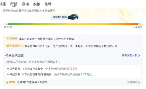 选择二手车本就比新车更加实惠,而这辆二手奥迪Q7的报价更是诚意满满。新车指导价为63.28万元,而现在的二手车报价仅为42.3万元,相较于新车,选择这辆奥迪Q7能省下20多万元,如此优惠的价格无疑让其成为了市场上的佼佼者。根据大数据预估显示,这辆奥迪Q7的二手车报价在同款车型中处于较低的水平,相较于同车系均价低了8.71万,这无疑进一步增加了其购买吸引力。更值得一提的是,这一价格在全国范围内都是极具竞争力的,对于追求性价比的消费者来说,无疑是一个不可多得的机会。
