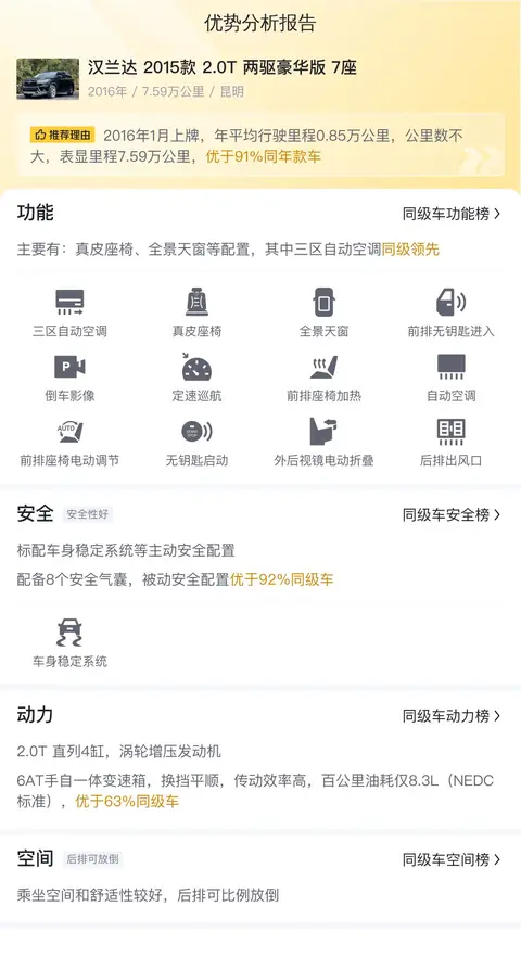 综上所述,这款汉兰达 2015款 2.0T 两驱豪华版 7座在多个方面都表现出色。它拥有宽敞的内部空间和舒适的乘坐体验,适合多人家庭使用;配置丰富,包括无钥匙启动、全景天窗等实用配置;动力性能强劲,同时保持着较高的燃油经济性。作为一款二手车,它的价格相对较低,性价比较高。但是,需要注意的是,该车辆没有检测报告,建议在购买前一定要实地了解具体情况,确保车辆没有重大事故或维修记录。此外,也需要考虑车辆的维护和保养成本,以及可能存在的隐藏问题。尽管如此,这款汉兰达 2015款 2.0T 两驱豪华版 7座仍然是一款值得考虑的二手车选择。