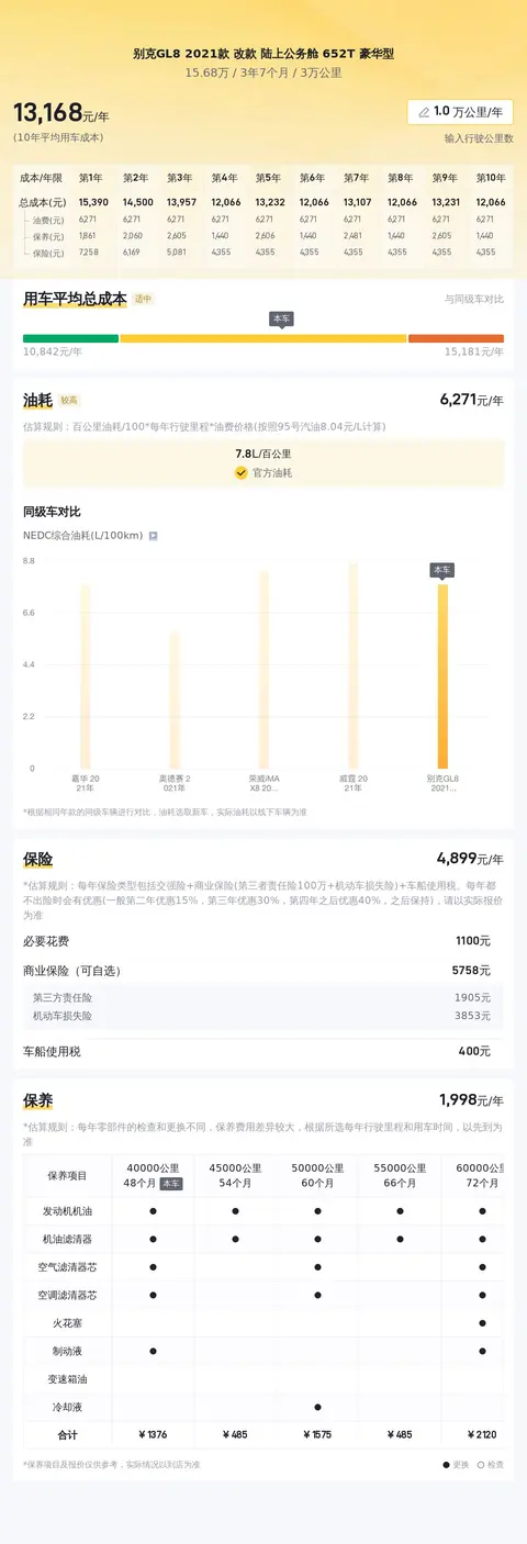 据估算,别克GL8 2021款 改款 陆上公务舱 652T 豪华型的用车成本是13154元/年,同级车最低是13154元/年,最高是19500元/年,所以它的用车成本较低。