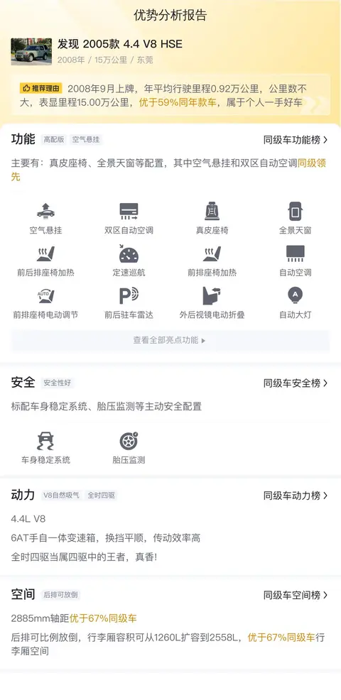 2005款发现(图片|配置|询价)4.4 V8 HSE是一款由英国汽车制造商路虎(Land Rover)生产的豪华SUV。它结合了越野能力和豪华内饰,旨在提供高级驾驶体验。这款车的特点包括强大的动力、豪华配置和越野性能。动力来源于4.4升V8汽油发动机,提供充沛的动力输出。内饰采用高级材料,配备多功能方向盘、皮革座椅、电动调节、加热功能、高级音响系统和气候控制系统。它还具备越野能力,包括四轮驱动系统和越野驾驶辅助技术。总的来说,2005款发现4.4 V8 HSE是一款能提供强大动力、豪华舒适和越野性能的豪华SUV,适合追求高端驾驶体验和越野探险的人士。下面这款发现 2005款 4.4 V8 HSE,算是发现系列中的经典代表,2008年上牌,中间经历了16年的时间,跑了15万公里,不过价格也到位了,目前报价13.88万,感兴趣的朋友可以看看。