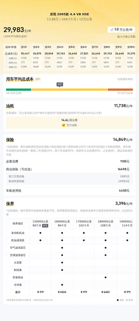 这款车的10年平均用车成本为 31,165 元/年,而同级车的最低10年平均用车成本为 26,764元/年,最高为 34,572元/年。考虑到这款车的性能和豪华配置,这一用车成本在同级车中属于合理范围。