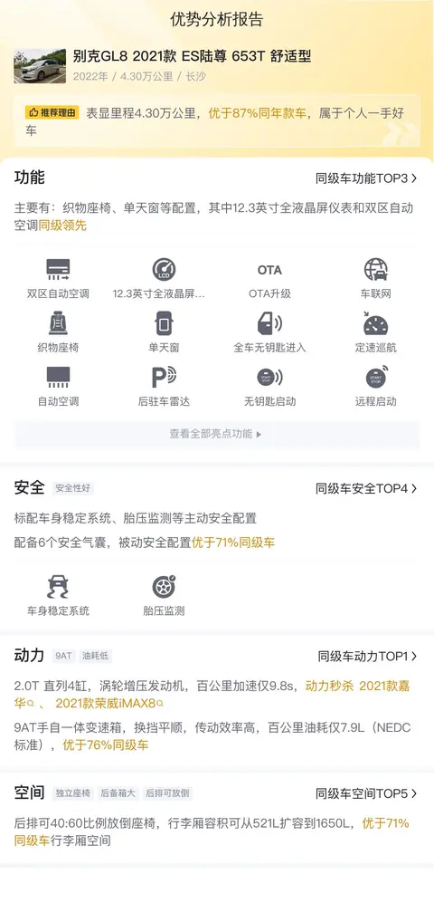 优势:作为MPV的代表车型,别克GL8既是老大哥的存在,也是实力的象征。市场欢迎度高,保值率也高。自身配置丰富,空间宽敞,动力强悍,而且里程值不高,加上价格实惠,是比较难得的好车。