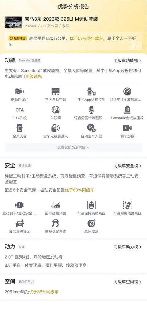 先来看看这辆二手宝马3系基础信息,该车的具体版本是——2023款改款325Li M运动套装。该车是2024年1月上牌,至今行驶了1.2万公里,车源地跟上牌地均为泉州,目前新车指导价34.99万,而我们的二手车报价为25.98万,开了一年多有近10万的差价,性价比还是不错的。该车目前是一手车,没有过户记录,外观为白色。