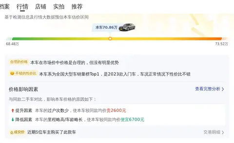 该车售价受里程、车龄、过户次数、颜色等因素影响。具体影响金额如下:里程,多于均值0.3万公里,-2600元;车龄,多于均值0.1年,-4100元;过户次数,少于均值0.3次,+2600元;颜色,黑色,0元。