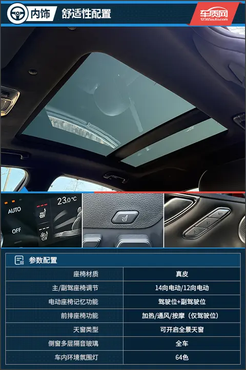 安全配置方面,评测车提供了丰富的主/被动安全配置,如主驾膝部气囊、前排中间气囊、前/后排侧气囊、前/后方碰撞预警以及车道偏离预警系统等,能够大幅提升对车内人员的安全防护。