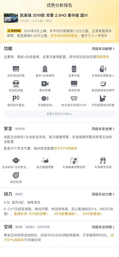 凯美瑞 2019款 双擎 2.5HG 豪华版 国VI,新车含税价为26.27万,现在的二手车报价是11.58万,2019年8月首次上牌,在此期间过户0次。
