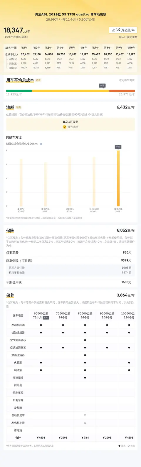 根据估算,这辆二手奥迪A6L的年均综合用车成本约为1.8万元。这项估算考虑了油费、保养费、保险费等因素,但具体支出可能会随个人使用习惯及车况而有所不同。