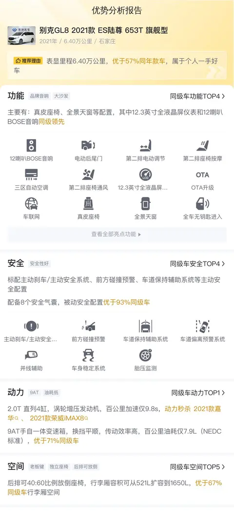 接下来,我们来聊聊这辆别克GL8 2021款 ES陆尊 653T 旗舰型的配置情况。在配置上,这款车主要有真皮座椅、全景天窗等配置,其中12.3英寸全液晶屏仪表和12喇叭BOSE音响同级领先。从动力来看,这款车搭载2.0T 直列4缸,涡轮增压发动机,百公里加速仅9.8s,动力秒杀2021款嘉华、2021款荣威iMAX8,9AT手自一体变速箱,换挡平顺,传动效率高,百公里油耗仅7.9L(NEDC标准),优于71%同级车。在空间部分,这款车的后排可40:60比例放倒座椅,行李厢容积可从521L扩容到1650L,优于67%同级车行李厢空间。