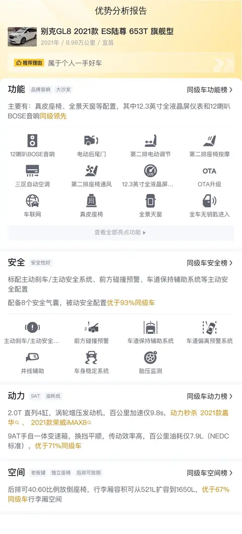报价远远低于市场行情价,占有很大优势,因为别克GL8 2021款 ES陆尊 653T 旗舰型的市场行情价是24.70万-31.14万,它的报价则是22.98万,相当于开了3年多,还跟新车差不了多少,难得的是,里程用得不多,所以性价比很高。