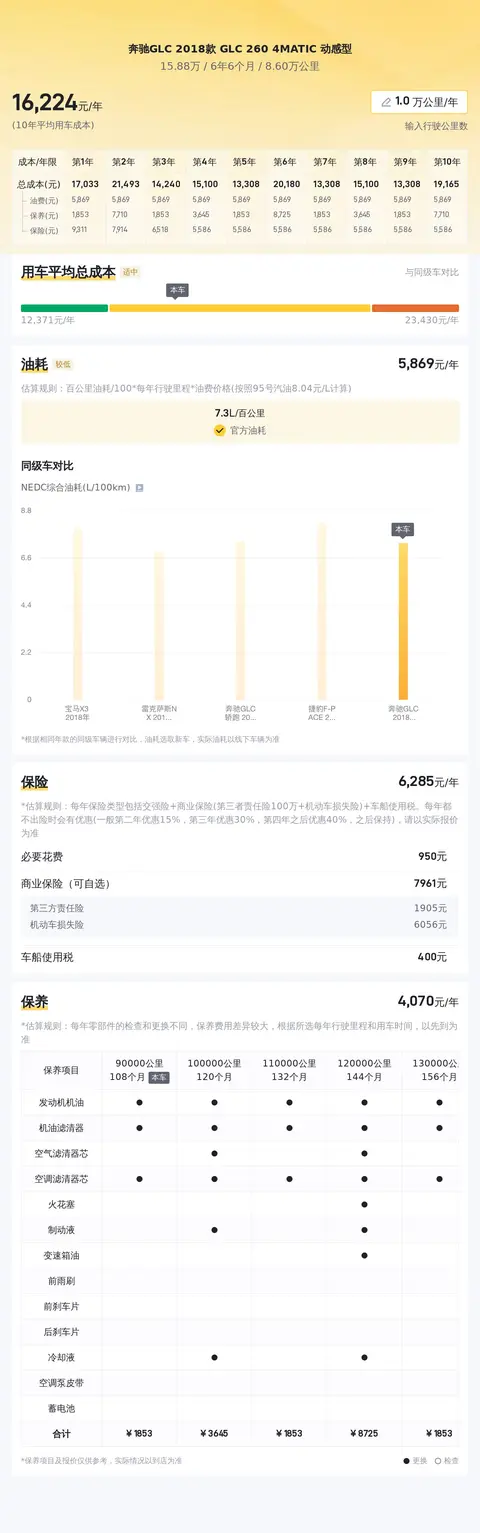 据估算,奔驰GLC 2018款 GLC 260 4MATIC 动感型的用车成本较低,因为同级车的最低用车成本是15958元/年,最高是21726元/年,奔驰GLC 2018款 GLC 260 4MATIC 动感型是15958元/年,所以较低。