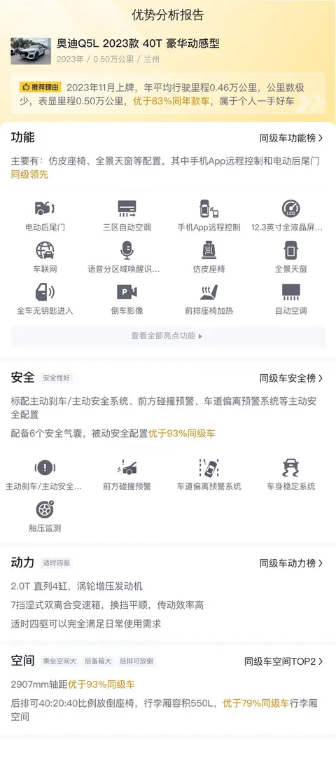 按照懂车帝的规则,我们暂且先按照参数库里的规矩继续介绍这台车。奥迪Q5L 2023款 40T 豪华动感型搭载了一台2.0T涡轮增压发动机,最大功率140kW(190马力),最大扭矩320N·m,匹配7挡双离合变速箱。虽然动力输出不算特别激进,但对于日常使用来说绰绰有余。其WLTC综合油耗为7.77L/100km,相对较低,这得益于发动机的节能技术,在保证动力性能的同时也考虑到了燃油经济性,更加贴近家庭用车的实际需求。