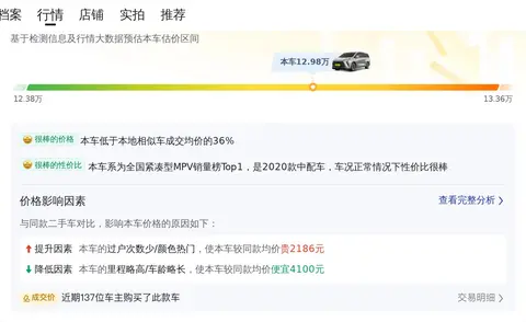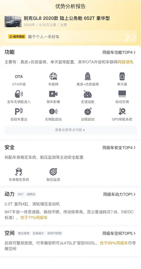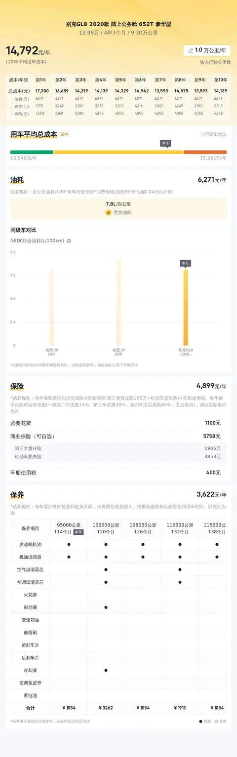 根据大数据预估显示,别克GL8 2020款 陆上公务舱 652T 豪华型商务车的二手车价格区间在12.73万至15.44万之间。而本车的报价则是12.98万,这样的价格在市场中是有竞争力的。同时,本车是2020款中配车,车况正常情况下,性价比还是不错的。另外,这款车的10年平均用车成本大约是14645元/年。