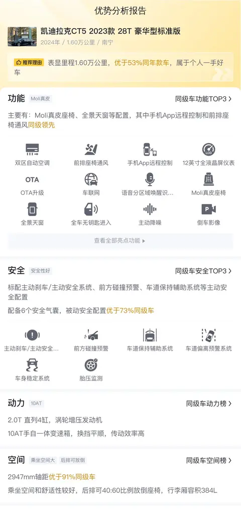 凯迪拉克CT5 2023款 28T 豪华型标准版在配置上体现出了凯迪拉克品牌的豪华与科技实力。主要亮点包括Moli真皮座椅、全景天窗等配置,其中手机App远程控制和前排座椅通风同级领先。动力方面,搭载的2.0T直列4缸,涡轮增压发动机和10AT手自一体变速箱,确保了强劲而平顺的动力输出。空间方面,2947mm的轴距提供了宽敞的乘坐空间和40:60可放倒的后排座椅增加了行李厢的灵活性。总体而言,这款车在豪华感、动力性能和空间舒适性上均表现出色,适合追求高品质驾乘体验的消费者。