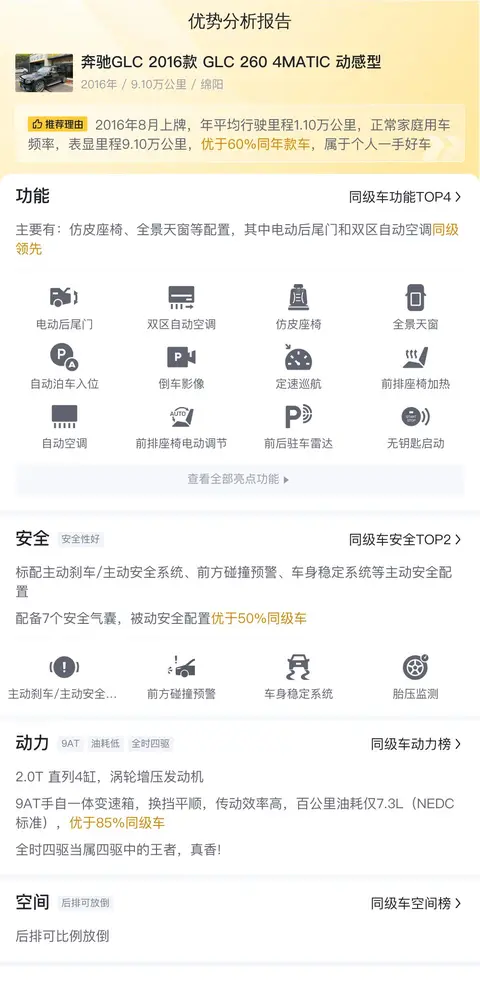 总结:以上就是我们对这辆二手奔驰GLC 2016款 GLC 260 4MATIC 动感型的全部介绍了,您觉得这辆车怎么样?是否符合您的心意呢?