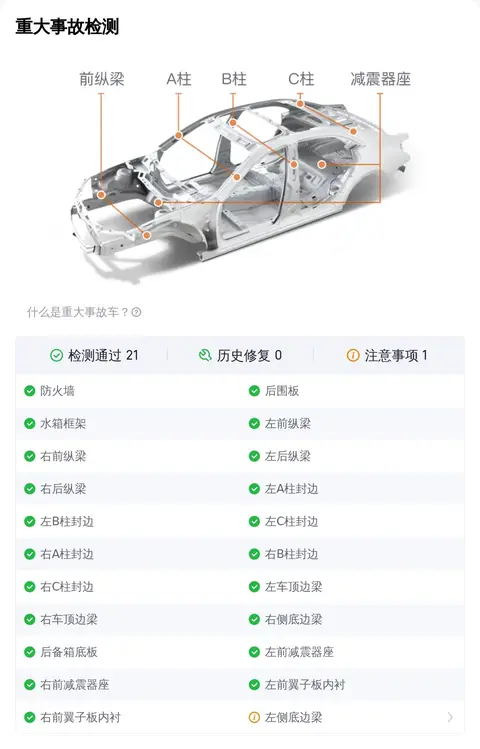 在车况部分,除了外观、内饰功能的检测,更多买家关注的是这辆车是否为“三非”车辆,三非就是指非重大事故、非火烧、非水泡。因为事故车、泡水车、火烧车都存在较大的安全隐患。不过您放心,这辆车已经通过了事故检测、火烧检测和泡水检测,可以确定它非重大事故车、非火烧车、非泡水车。