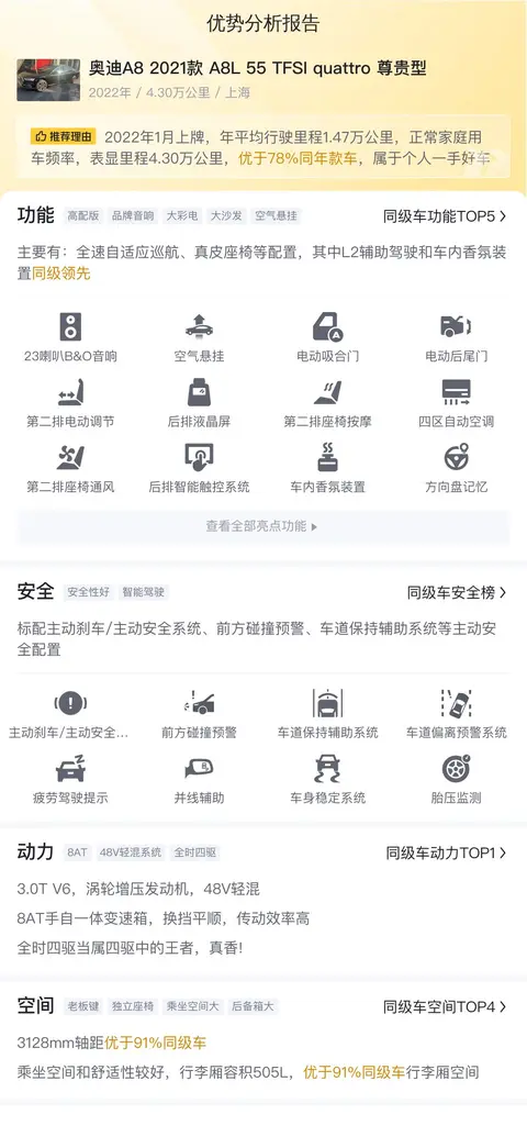综上所述,这辆2021款奥迪A8L 55 TFSI quattro尊贵型二手车在车况、配置、性能等方面都表现出了豪华旗舰车型应有的水准。如果你正在寻找一辆高品质的豪华二手车,那么这辆奥迪A8L无疑是一个值得考虑的选择。